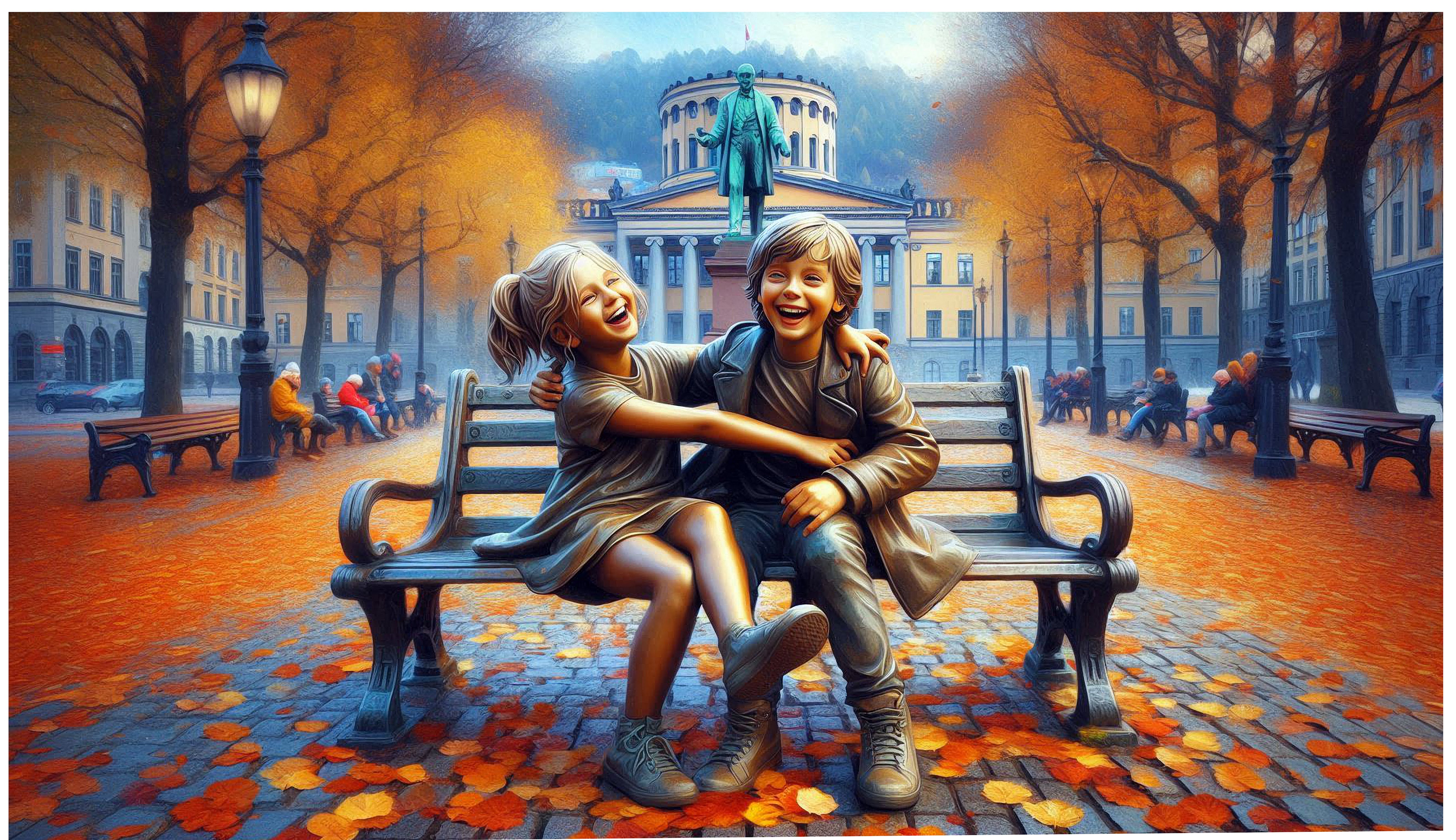 I dag er det flott vintervær i Oslo og rene høstværet. Jeg har blitt litt forkjøla og holder meg inne i dag, men jeg har ved hjelp av kunstig intelligens bedt Microsoft Billedskaper Dall E-3 om å generere noen malerier av jenter og gutter som sitter på en benk på Karl Johans gate i Oslo og at det skal være høstvær med løv på bakken.