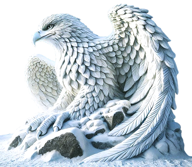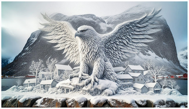 Søndag 12. januar 2025 lagde jeg ved hjelp av kunstig intelligens noen «malerier» av noen «ørneskulpturer» i helfigur. I stedet for «ekte» ørner, ønsket jeg at ørnene skulle være laget av snø og at de skulle stå som skulpturer i et litt «gammeldags og romantisk vinterlandskap i en småby med snø i lufta.»